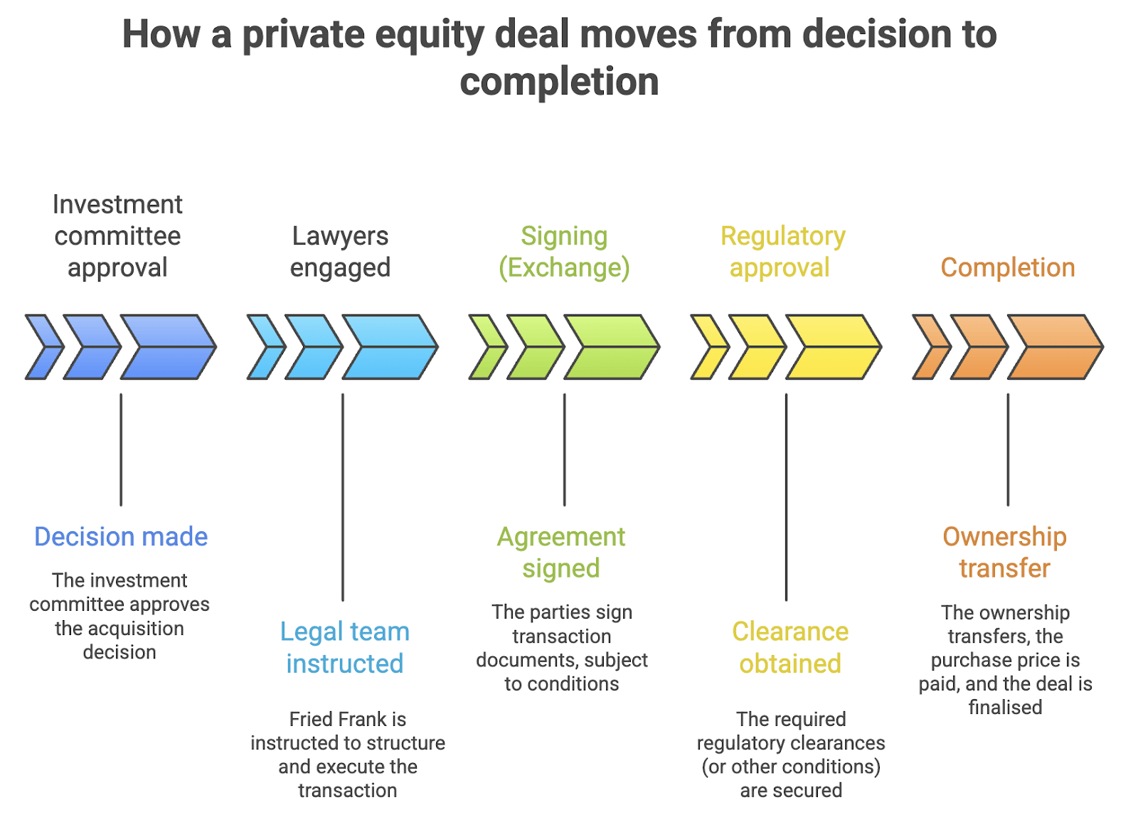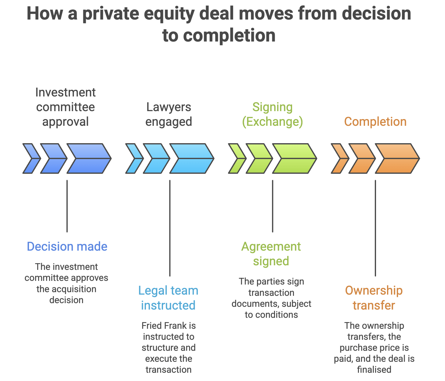 Once the PE firm approves a deal, the focus shifts from whether to invest to how to complete the transaction – and that’s when Fried Frank gets more involved. Their work is time-sensitive, with deals often running on a tight timetable (this deal had around one month to complete).