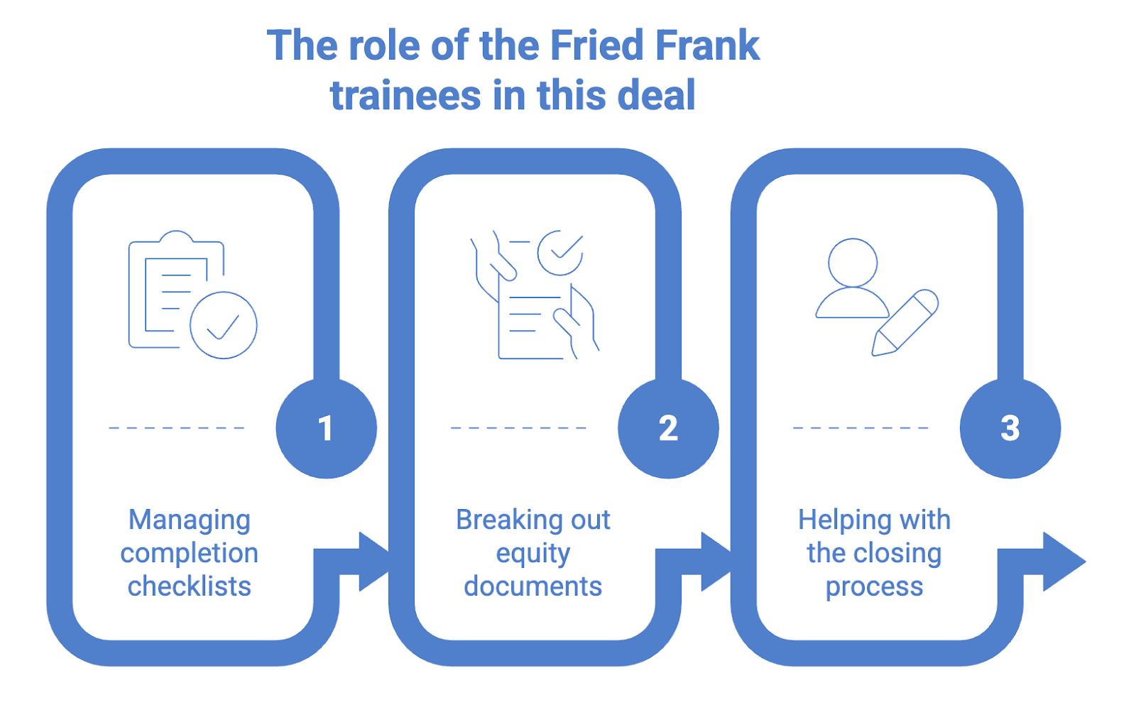 At Fried Frank, trainees are actually involved in transactions like this. They manage checklists, finalise key documents, review funds flows, manage the completion process and help keep deals moving day to day.